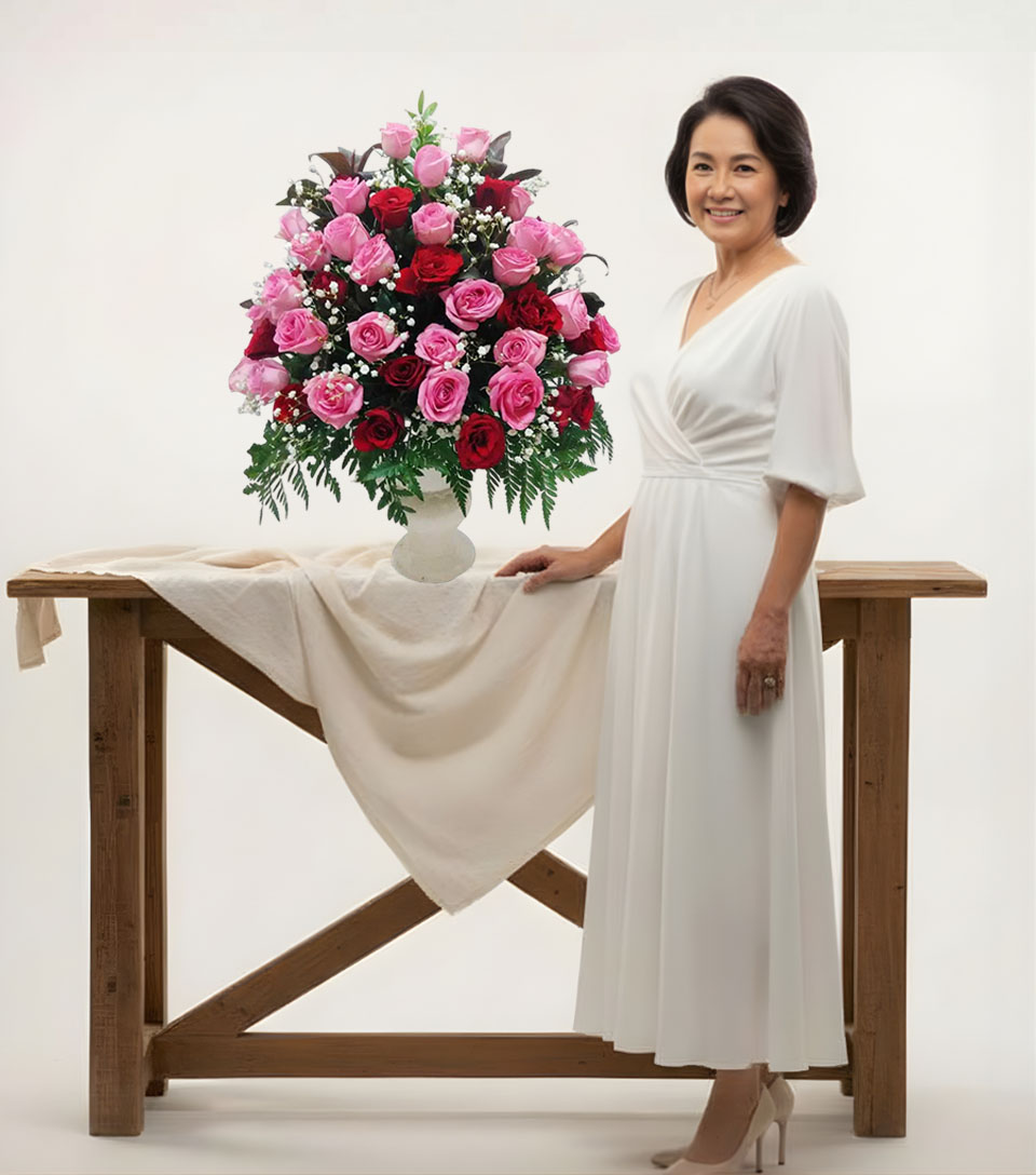 Bunga meja dengan menggunakan bunga mawar merah dan pink cocok untuk di jadikan hadiah atau kado untuk orang tersayang