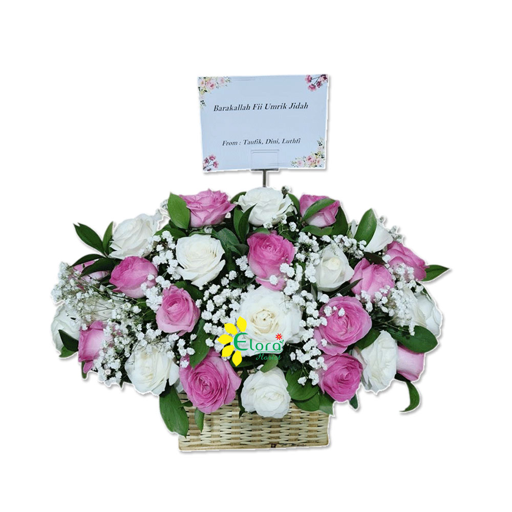 Bunga meja dengan bunga mawar dengan vas rotan