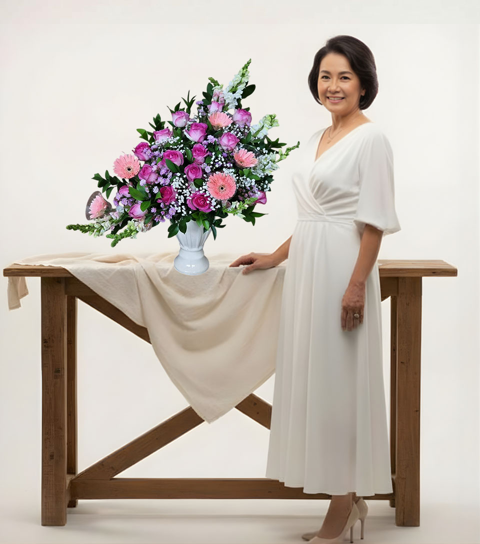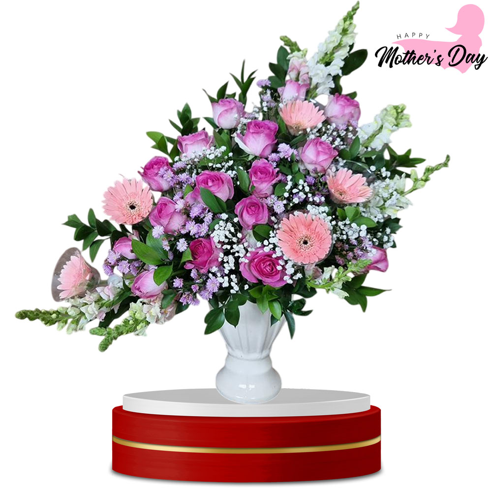 Bunga Meja Hari Ibu dengan bunga mawar dan garbera dengan vas keramik