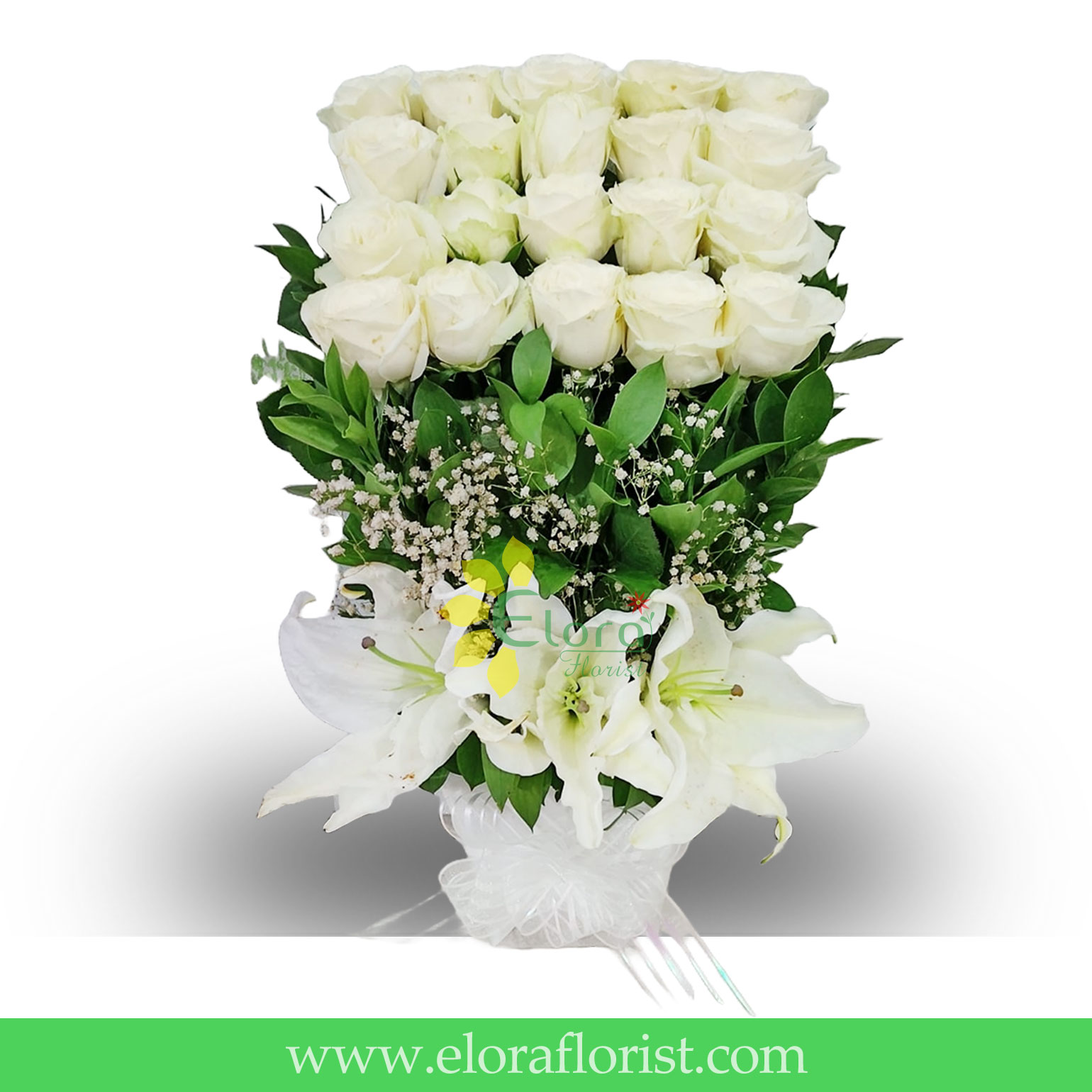 Bunga meja mawar putih dan bunga lily menggunakan vas rotan