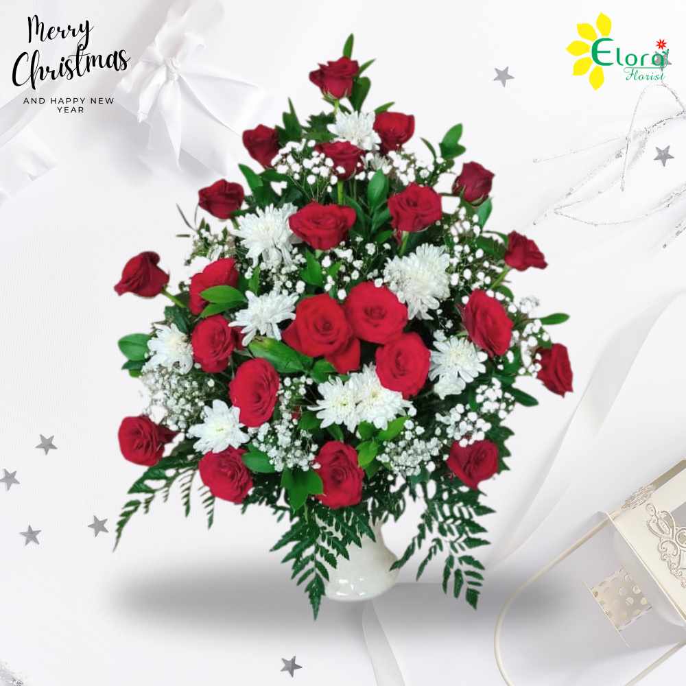 Bunga meja natal dengan bunga mawar merah dan bunga mawar putig yang menggunakan vas keramik