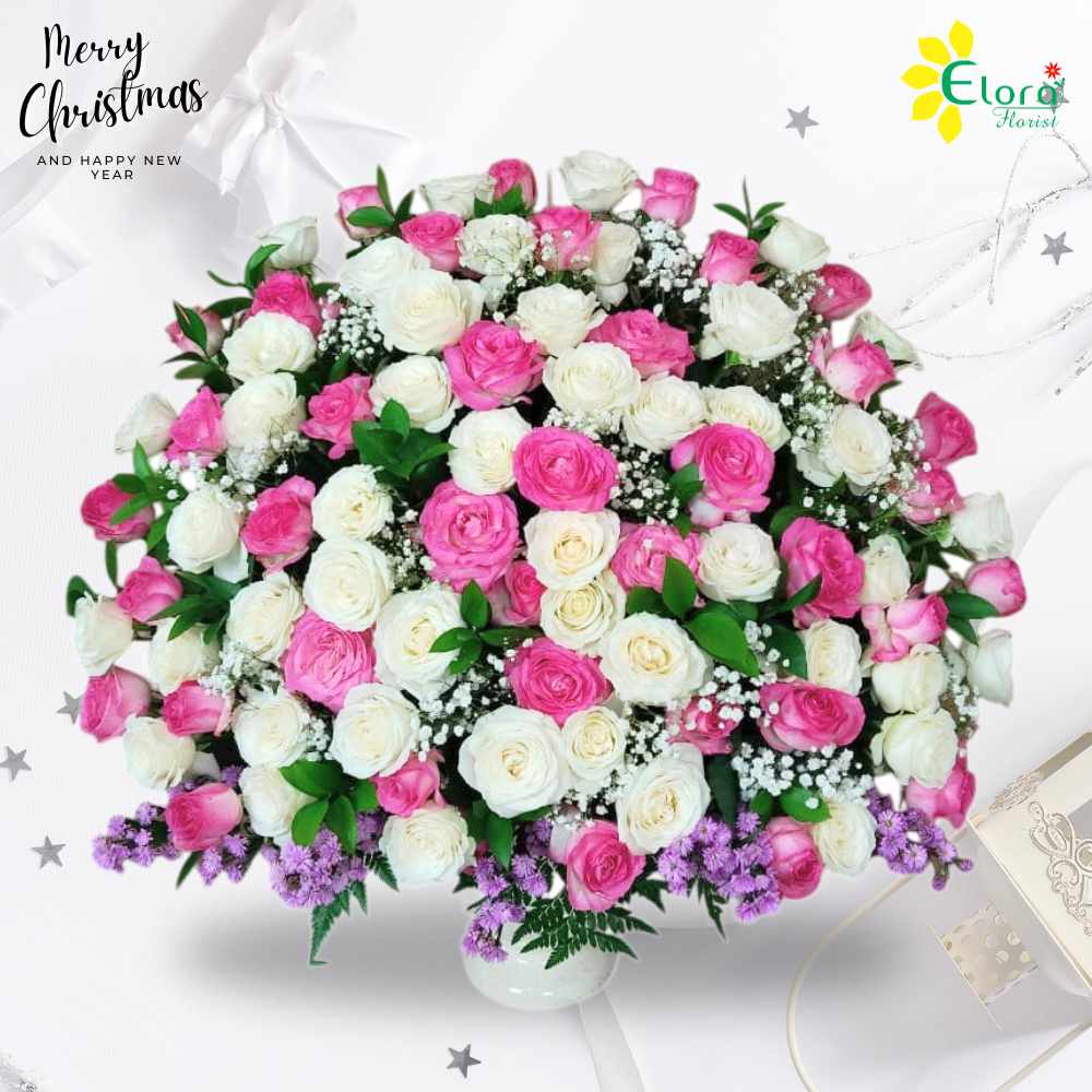 Bunga meja natal dengan bunga mawar pink dan bunga mawar putih dengan vas keramik