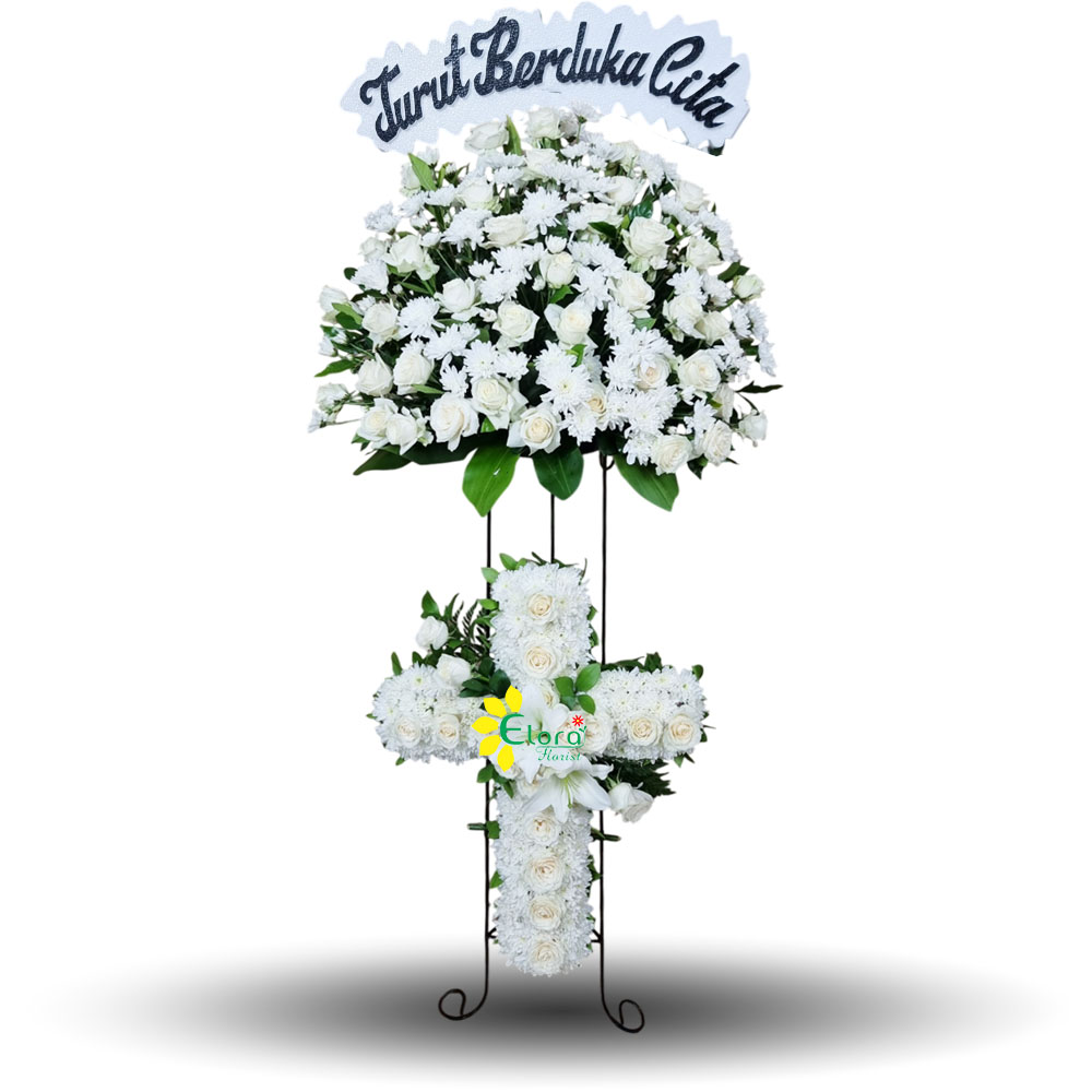 Rangkaian bunga standing flower duka cita dua tingkat ini memadukan keindahan mawar putih dan krisan dalam bentuk salib, memberikan simbol penghormatan terakhir yang suci dan tulus. Cocok untuk mengungkapkan belasungkawa secara elegan dan penuh makna.