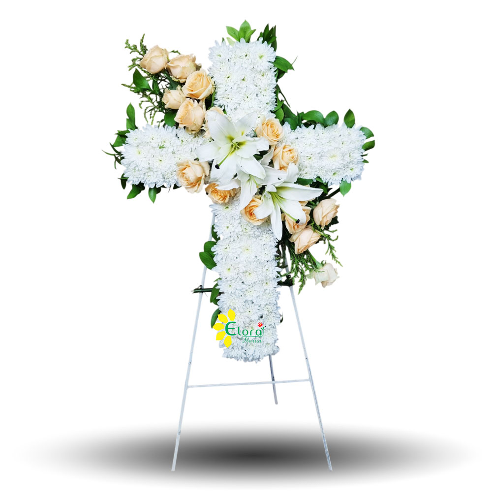 Rangkaian bunga salib elegan dari Elora Florist ini dirangkai dengan bunga krisan putih, lily, dan mawar peach, melambangkan ketulusan dan penghormatan terakhir. Cocok untuk memberikan ucapan belasungkawa yang penuh kasih dan damai.