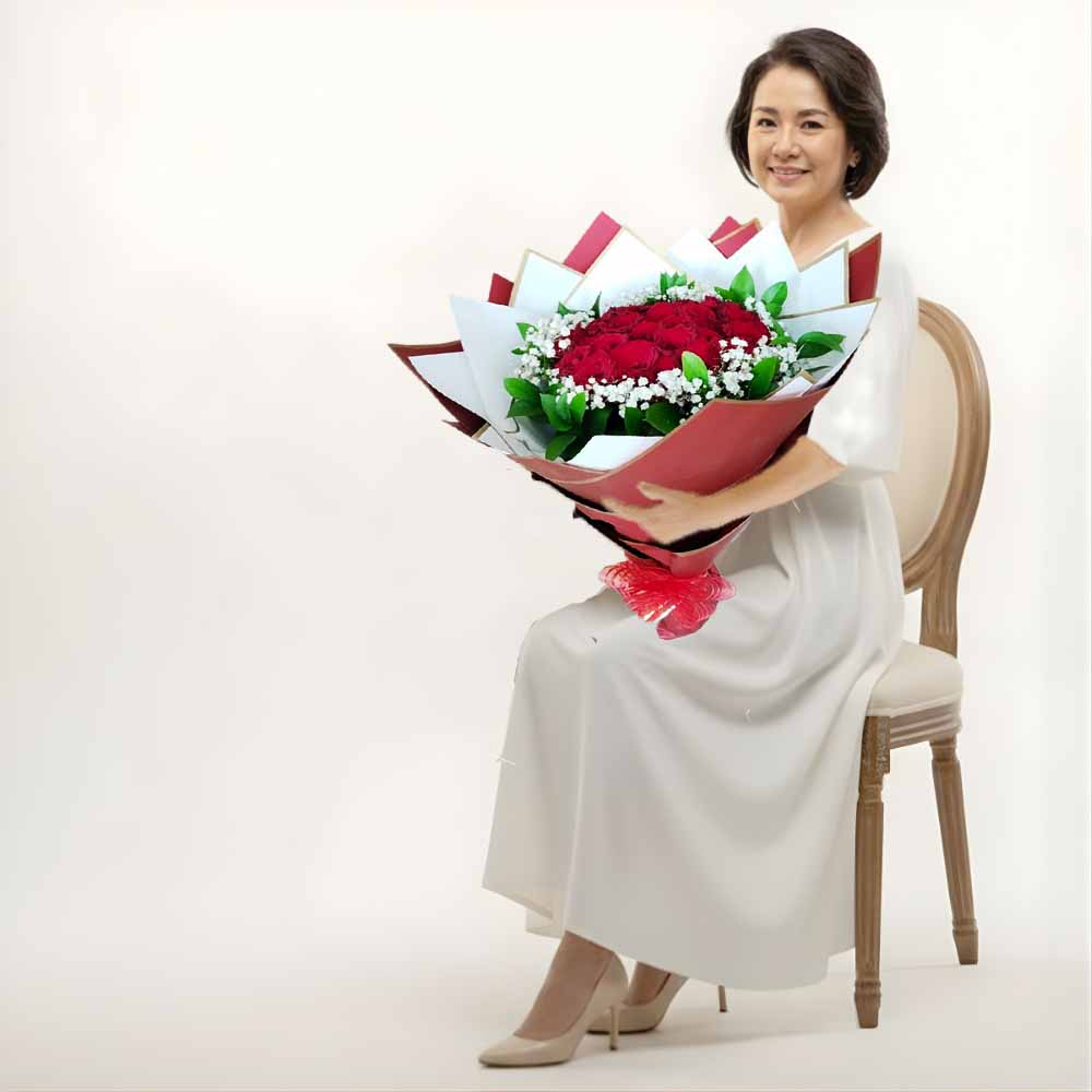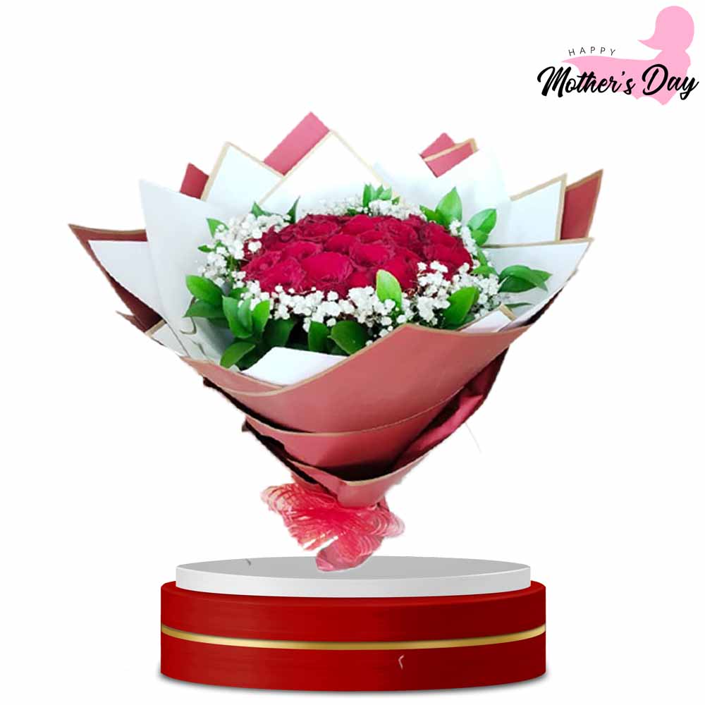 Bouquet hari ibu Medium dengan 20 tangkai bunga mawar merah dan baby breath