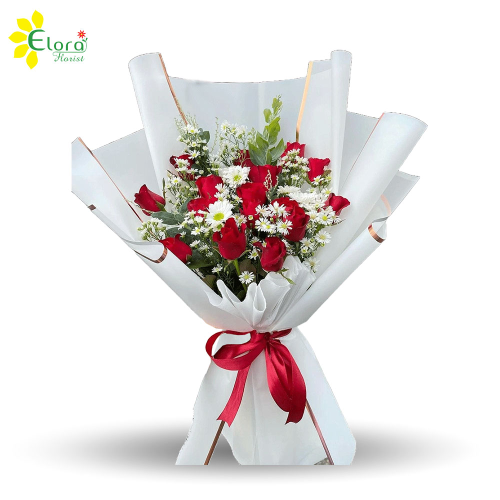 Handbouquet bunga mawar dengan 15 tangkai bunga mawar merah