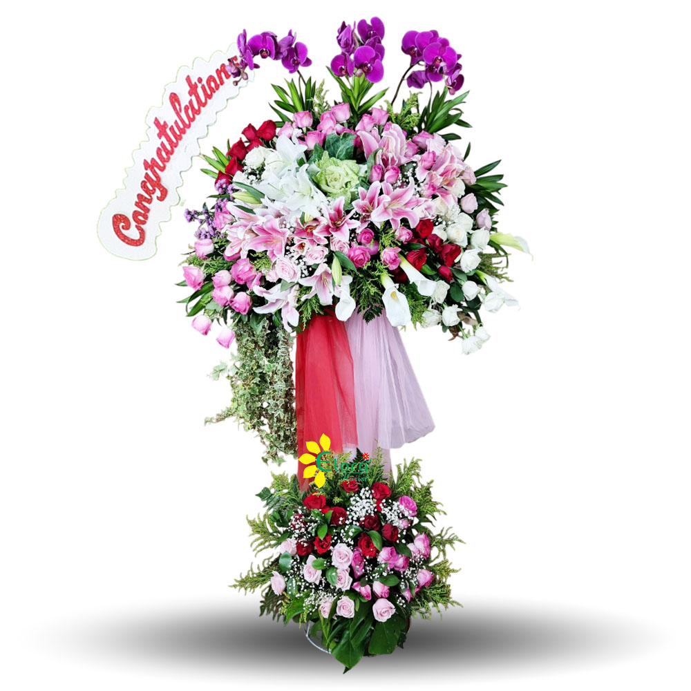 Rangkaian standing flower ini hadir dengan perpaduan anggrek ungu, lily, mawar merah muda, putih, dan merah yang dirangkai indah serta dilengkapi aksen kain dan hiasan “Congratulations” atau ucapan lain yang sesuai dengan keinginan anda. Sangat cocok untuk momen perayaan penting seperti pembukaan bisnis, pelantikan, atau kenaikan jabatan. Tampil mewah, ceria, dan penuh kesan positif.