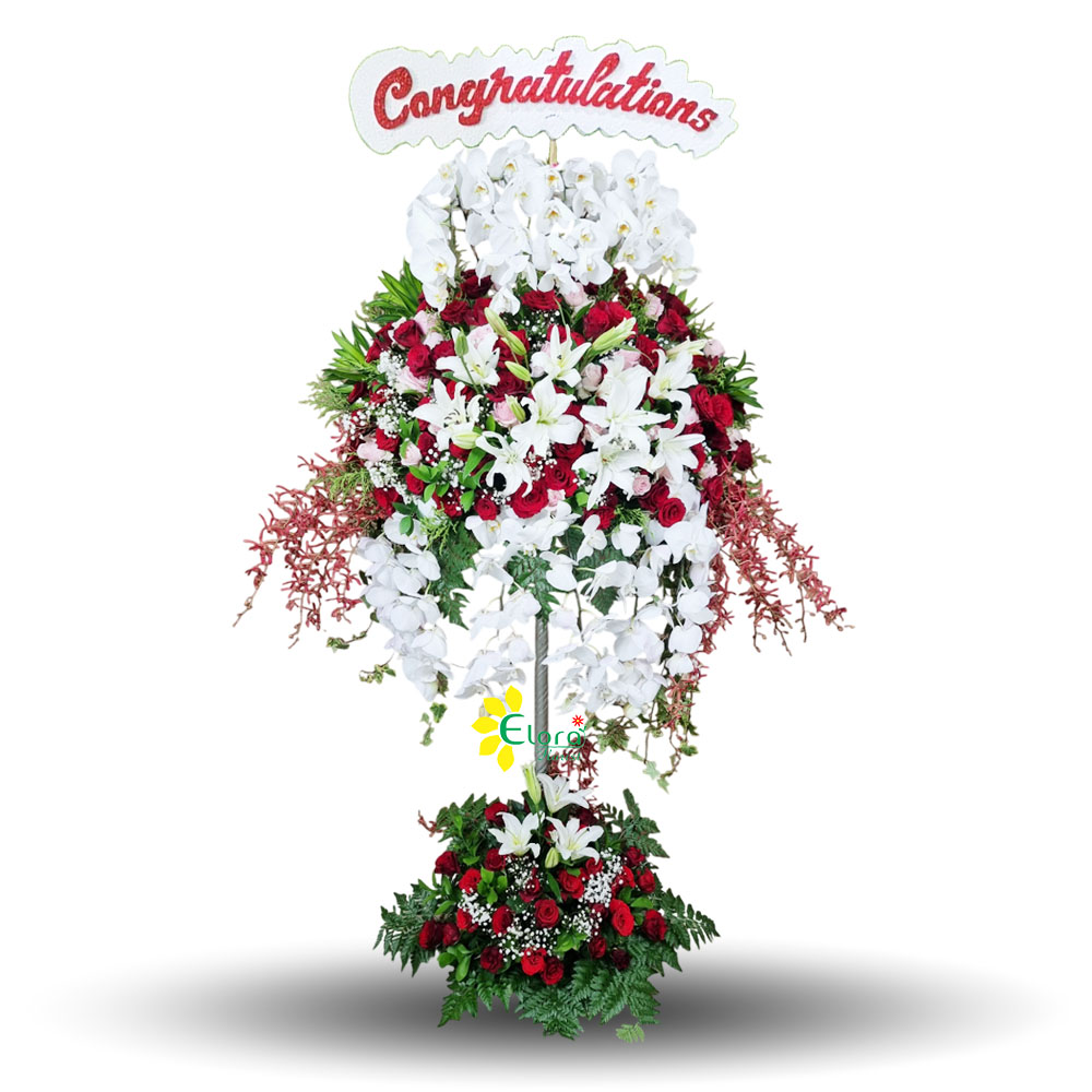 Rangkaian standing flower ini hadir dengan perpaduan anggrek putih, lily, mawar merah muda, dan merah yang dirangkai indah serta dilengkapi hiasan “Congratulations” atau ucapan lain yang bisa disesuaikan dengan keinginan anda. Sangat cocok untuk momen perayaan penting seperti pembukaan bisnis, pelantikan, atau kenaikan jabatan. Tampil mewah, ceria, dan penuh kesan positif.