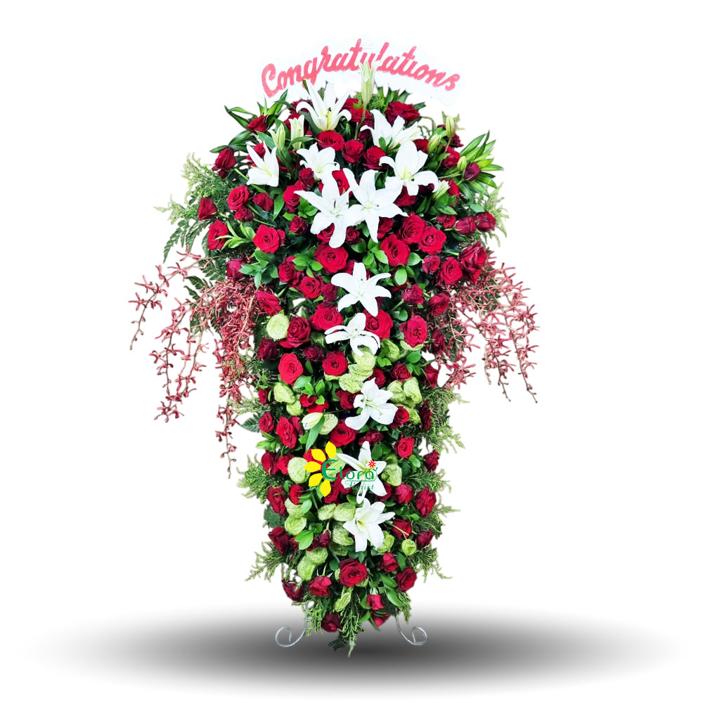 Tampilan megah dan elegan, standing flower ini dirangkai dengan mawar merah yang melambangkan keberanian dan cinta, dipadukan dengan lily putih yang memberi kesan kemurnian dan sukses. Cocok untuk ucapan selamat atas pembukaan bisnis, promosi jabatan, atau acara perayaan lainnya. Hadir sebagai simbol kebahagiaan dan penghargaan tinggi.