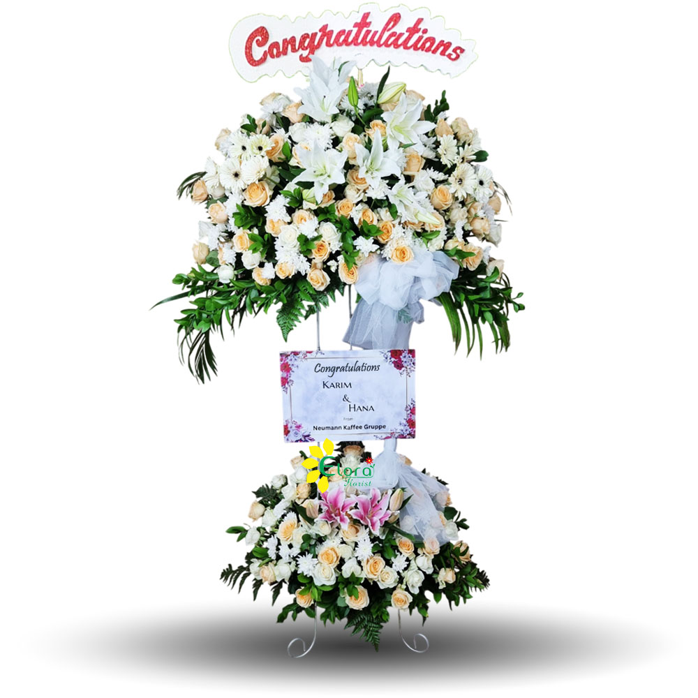 Rangkaian standing flower ucapan selamat ini hadir dengan komposisi warna lembut dari mawar putih, peach, serta lily oriental yang anggun. Dibalut dalam dua tingkat bunga yang tersusun rapi, cocok untuk memberi ucapan selamat pernikahan, grand opening, atau acara prestisius lainnya. Perpaduan warna pastel memberikan kesan manis, elegan, dan penuh kebahagiaan.