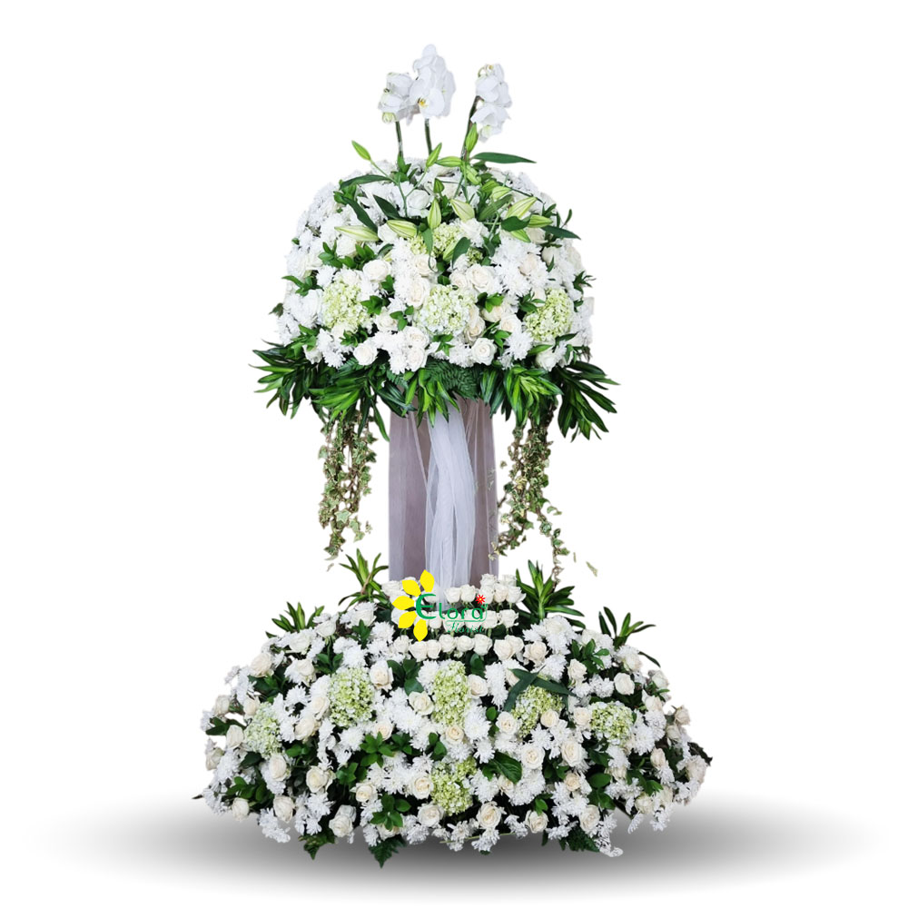 Standing Flowers Duka Cita SFF-051 adalah pilihan sempurna untuk menyampaikan belasungkawa dengan penuh ketulusan. Dirangkai secara vertikal dua tingkat, bunga ini didominasi oleh bunga putih seperti mawar, lili, krisan, dan anggrek bulan yang memberikan kesan damai dan sakral. Didesain khusus dengan nuansa elegan dan mewah, standing flower ini cocok dikirimkan ke rumah duka, tempat ibadah, atau lokasi persemayaman sebagai bentuk penghormatan terakhir bagi yang telah berpulang.