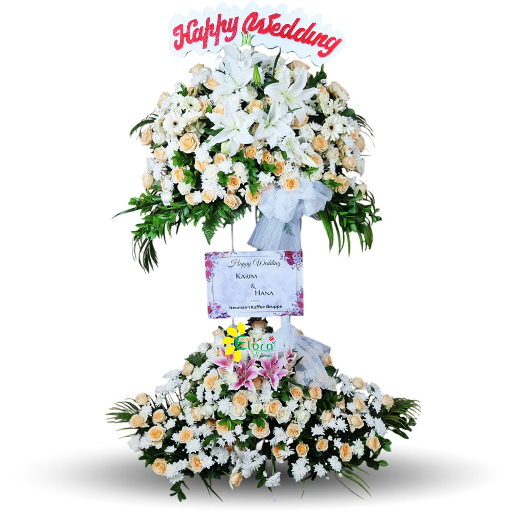 Standing flower Happy Wedding dua tingkat bernuansa peach dan putih dengan mawar, lily, dan bunga segar lainnya, dengan isian bunga yang lebih padat memberikan kesan mewah dan elegant sangat cocok untuk ucapan pernikahan keluarga, sahabat, maupun kolega karena akan menjadi daya tarik pada acara pernikahan.
