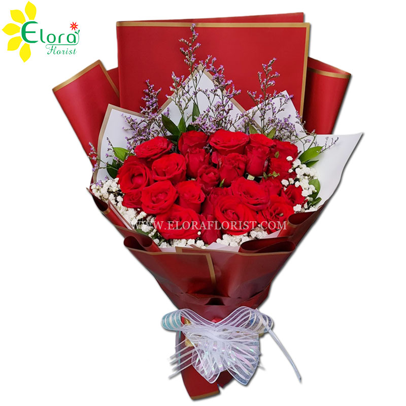 Bouquet Valentine Medium dengan 20 tangkai bunga mawar merah dan baby breath